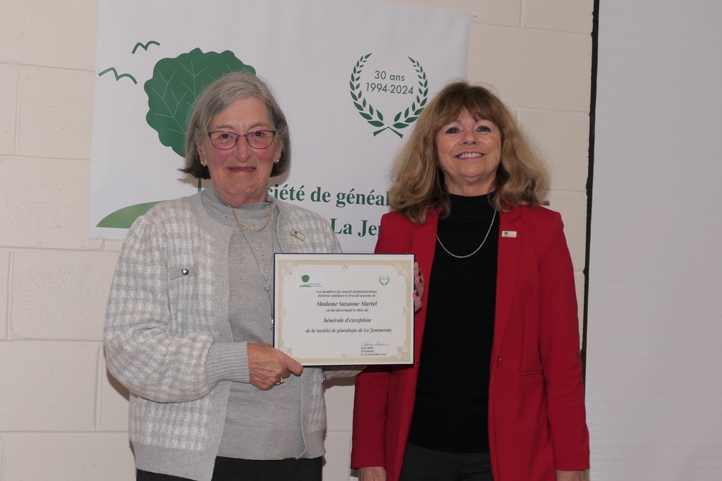 Par son engagement auprès de la société de généalogie de La Jemmerais, Madame Martel se mérite notre reconnaissance. Les membres du conseil d'administration sont unanimes et fiers de lui offrir le titre de Bénévole d'exception 2025, en remerciement pour son énorme contribution à garder une société de généalogie active et en santé.