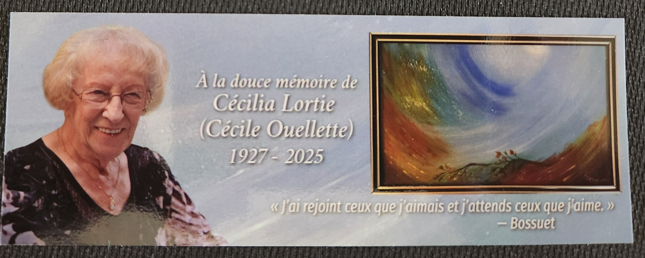 Madame Cécilia Lortie, mère de Gaetan Ouellette, sécrétaire de la société de Généalogie de La Jemmerais, est décédée le 9 décembre à l'âge de 98 ans. Un dernier hommage lui a été rendu le 20 décembre 2025.